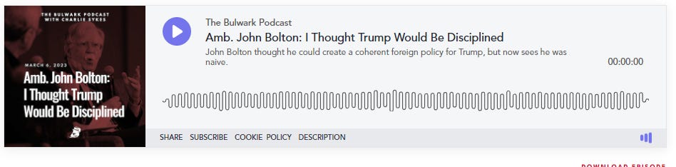 My full conversation with John Bolton is up at the Bulwark podcast. (You can also find a full transcript here.)