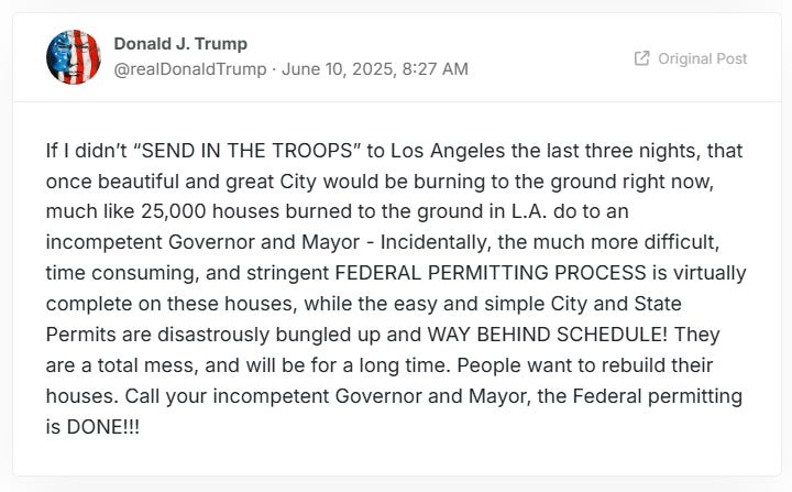 But of course what’s happening in Los Angeles is no joking matter. We pray that all will go well, and that no Marines or Guardsmen will be hurt or will hurt others. We hope the deployment will be short-lived and doesn’t in fact become a precedent that Trump succeeds in exploiting. And we trust that the courts, the Congress, and the country will succeed in defending the Constitution against Trump’s project of usurpation, of which the deployment of the military to Los Angeles is a part.