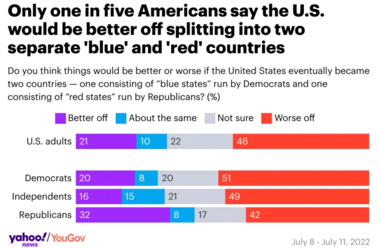 And red-state Trump voters divide roughly down the middle on the question of whether things would be better (37%) or worse (40%) if the country as a whole actually split into a Blue Nation and a Red Nation. No other cohort views disunion so favorably.