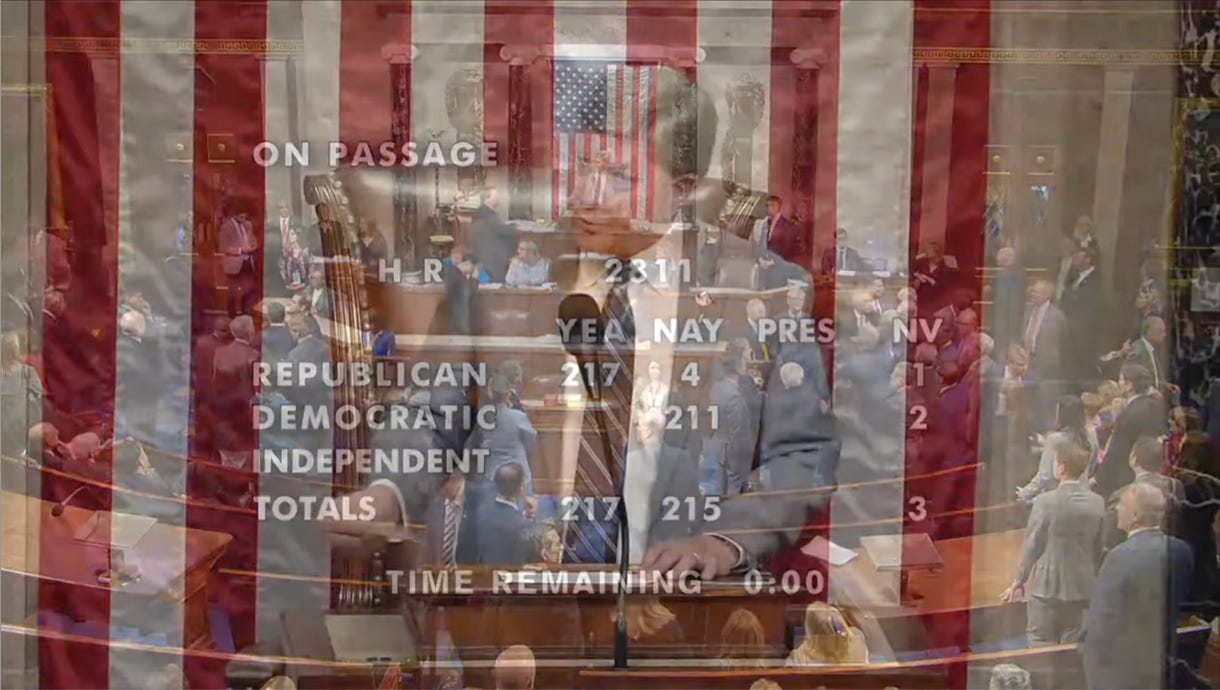 McCarthy gets the votes… The first salvo in the debt ceiling has been voted on in the House, and H.R. 2811, the Limit, Save, Grow Act of 2023, passed 217 to 215. It is dead on arrival in the Senate. Obligatory: the rap. The final “AYE”? George Santos, of course. He tried to make a big deal of it, but it backfired. The four NAYS: Buck, Gaetz, Biggs, and Burchett.