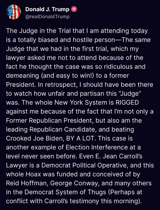 DONALD TRUMP: [Muttering loudly during the testimony of rape-victim E. Jean Carroll “con job” . . . “witch-hunt.”]