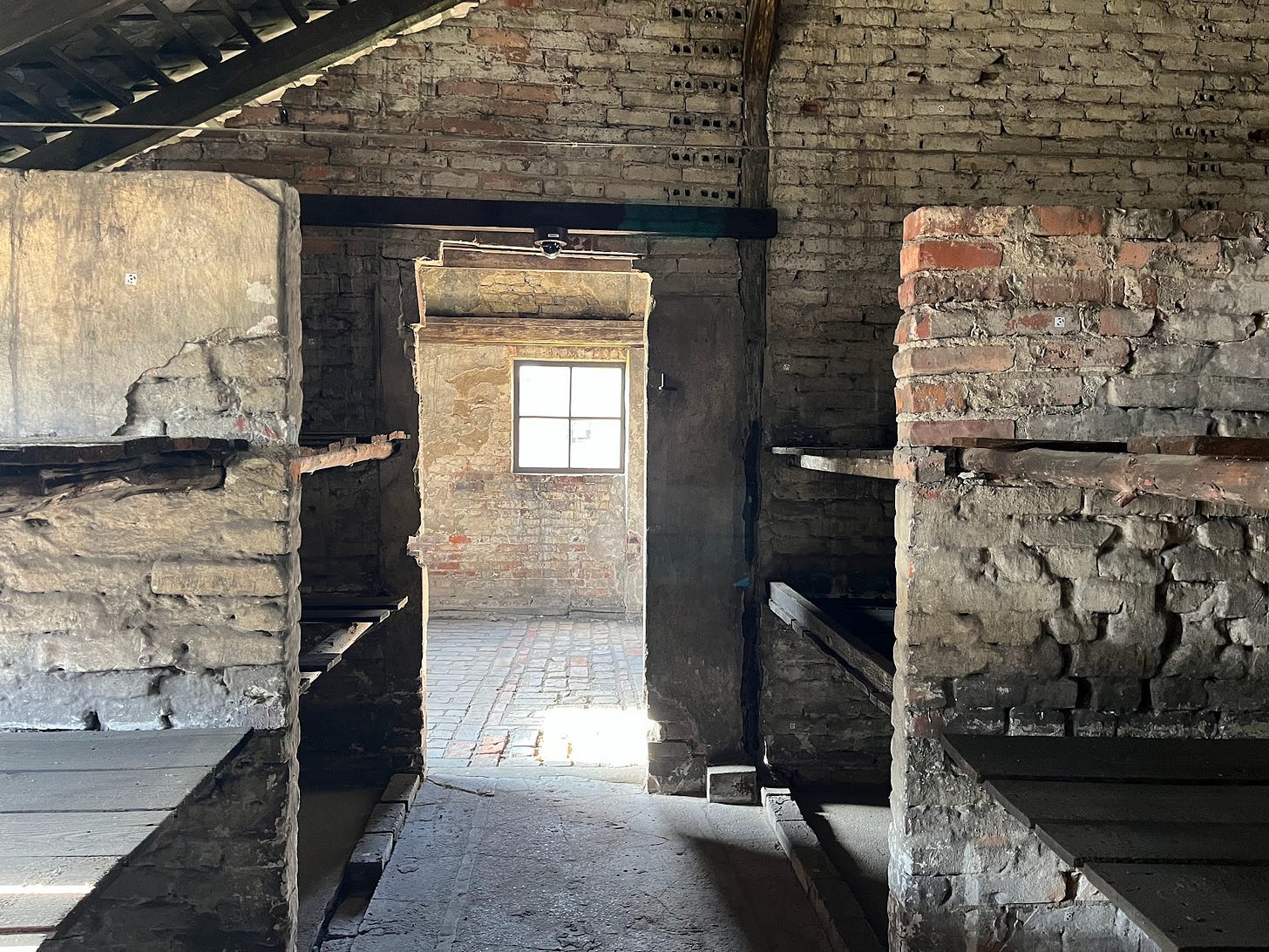 Its austere design and brick-on-brick construction leave an impression of forcefulness, but this is overmatched by my sense of the unconquerable humanity present in the press of each foot that passed through this space. It’s a lot, to be confronted with all this while standing inside a mostly empty building. Anyone who is passingly historically literate has seen pictures of the faces and read the stories of victims of the Holocaust. But this is a different order of experience.