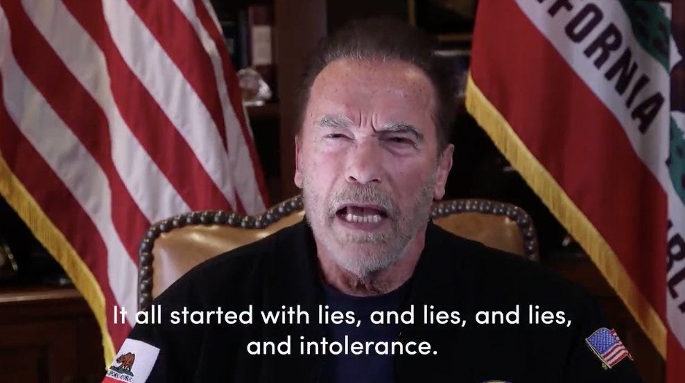 On this bonus, members-only episode of Across the Movie Aisle, Sonny Bunch (The Bulwark), Alyssa Rosenberg (The Washington Post), and Peter Suderman (Reason) discuss one of the few bright spots over the last week: Arnold Schwarzenegger’s impassioned plea for patriotism and reason in the face of the failed assault on Capitol Hill by Donald Trump’s most ardent supporters. The Austrian-born bodybuilder, actor, and politician—the living embodiment of the American Dream—used his own experiences to warn against the dark path down which we might be headed. And he used Conan the Barbarian’s sword to explain how we might avoid traveling it. Even if you don’t want to listen to this episode I implore you to watch his video.