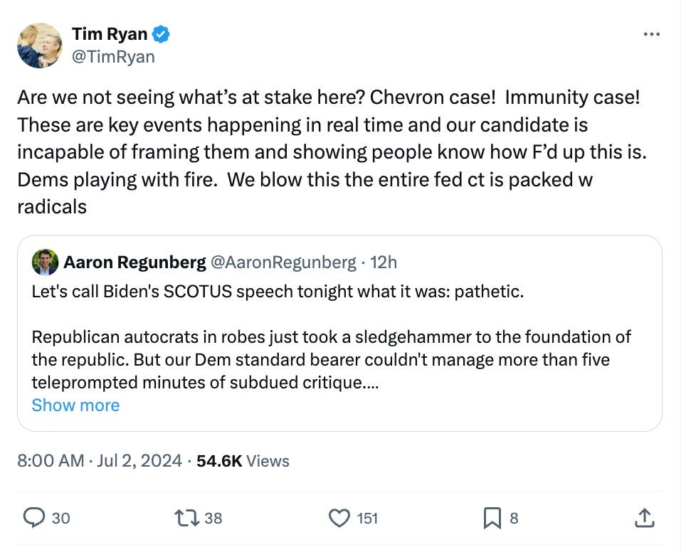 The Biden question is secondary at this point to the Trump/Supremes question. If Biden steps down we get Harris. If Biden falls down we get Harris. If Trump wins we lose our freedom. That should be the focus of every newsletter and editorial. This court has gone way beyond being extremist. They are so arrogant and corrupt that they feel they can totally disregard the most basic texts of the Constitution. The six crazies want to give all the power to their billionaire backers. Trump is just their lunatic dancing bear. Biden may be aging in place, but Trump has become a deranged serial killer. If he is elected he will use his power to destroy everyone and everything that bothers him, and this court will back him every time. We are already entering the age of Stalin in the US. Many of us who write things critical of Trump and the court on this forum will be in danger of prosecution. That's what presidents can do.