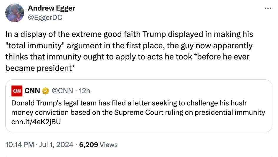 Biden himself, facing intense questions about his capacity to run for office, held a rare evening press availability where he sounded the alarm in a short speech from the White House last night. “I know I will respect the limits of the presidential powers, as I have for three and a half years,” he said. “But any president, including Donald Trump, will now be free to ignore the law.”