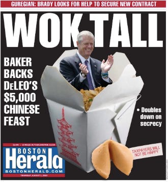 When Republican Gov. Charlie Baker defended both the $5k takeout bill and the lack of transparency, the Herald put that story on the front page. Like most broadsheets, the Herald's known for its colorful and provocative covers. They took the Chinese food angle, added a reference to Charlie Baker’s unusual height (at 6’6” he’s in Bill de Blasio territory), and the result is that front page.