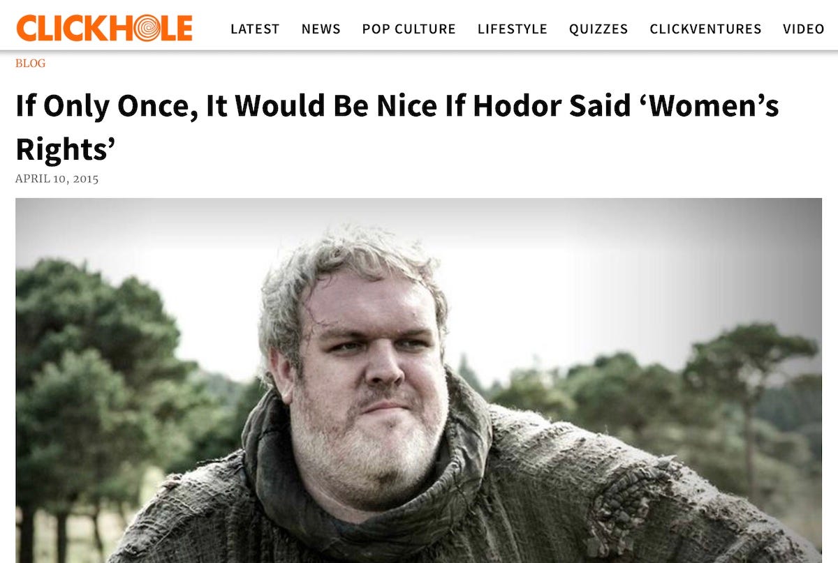 One of the best jokes ever told by Clickhole—the site created by The Onion to mock the rise of BuzzFeed-style click factories that rose to prominence in the 2010s—was a satirical piece titled “If Only Once, It Would Be Nice If Hodor Said ‘Women’s Rights.’”