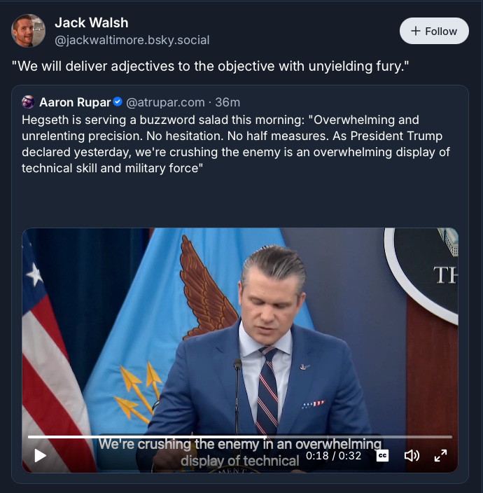 Credit to Bulwark+ member AngieP, who said the administration was treating war like a video game the day before the White House posted a video combining footage of the war with actual video games. Here’s her insight:
