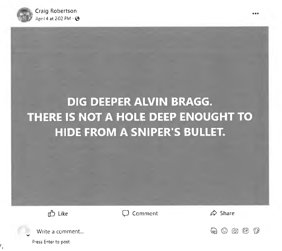 THE FELONY COMPLAINT AGAINST ROBERTSON spills out over thirty-nine pages. It charges the seventy-five-year-old Utah resident with three criminal counts. As you may have guessed, one of them is for the above-mentioned threat he posted targeting Bragg on March 18, 2023.