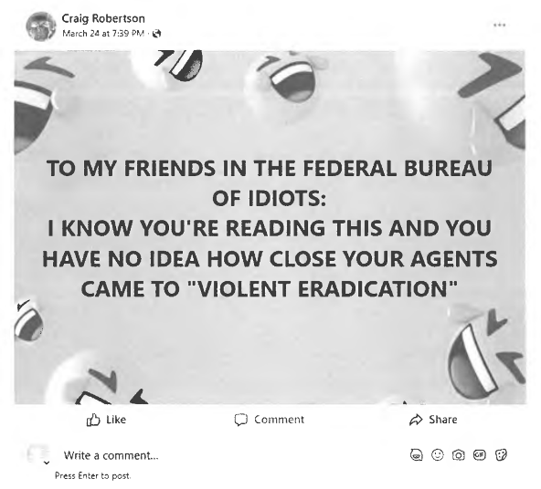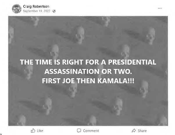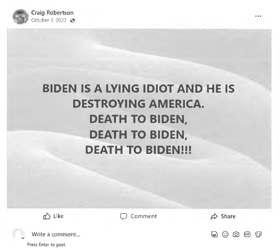 Finally, count three of the indictment alleges that, on or about August 7, 2023, Robertson threatened the life of President Joe Biden, in a post that said: “I HEAR BIDEN IS COMING TO UTAH. DIGGING OUT MY OLD GHILLE SUIT AND CLEANING THE DUST OFF THE M24 SNIPER RIFLE. WELCOM, BUFFOON-IN-CHIEF!”