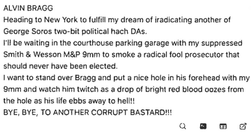 BRAGG’S BRIEF RECOUNTS Trump’s use of violent rhetoric in speeches and social media posts, one of which “included a picture of defendant holding a baseball bat and wielding it at the back of [Bragg’s] head.” It states that the former president’s proclamations have “resulted in credible threats of violence, harassment, and intimidation directed at the District Attorney, his staff, and the District Attorney’s Office.”