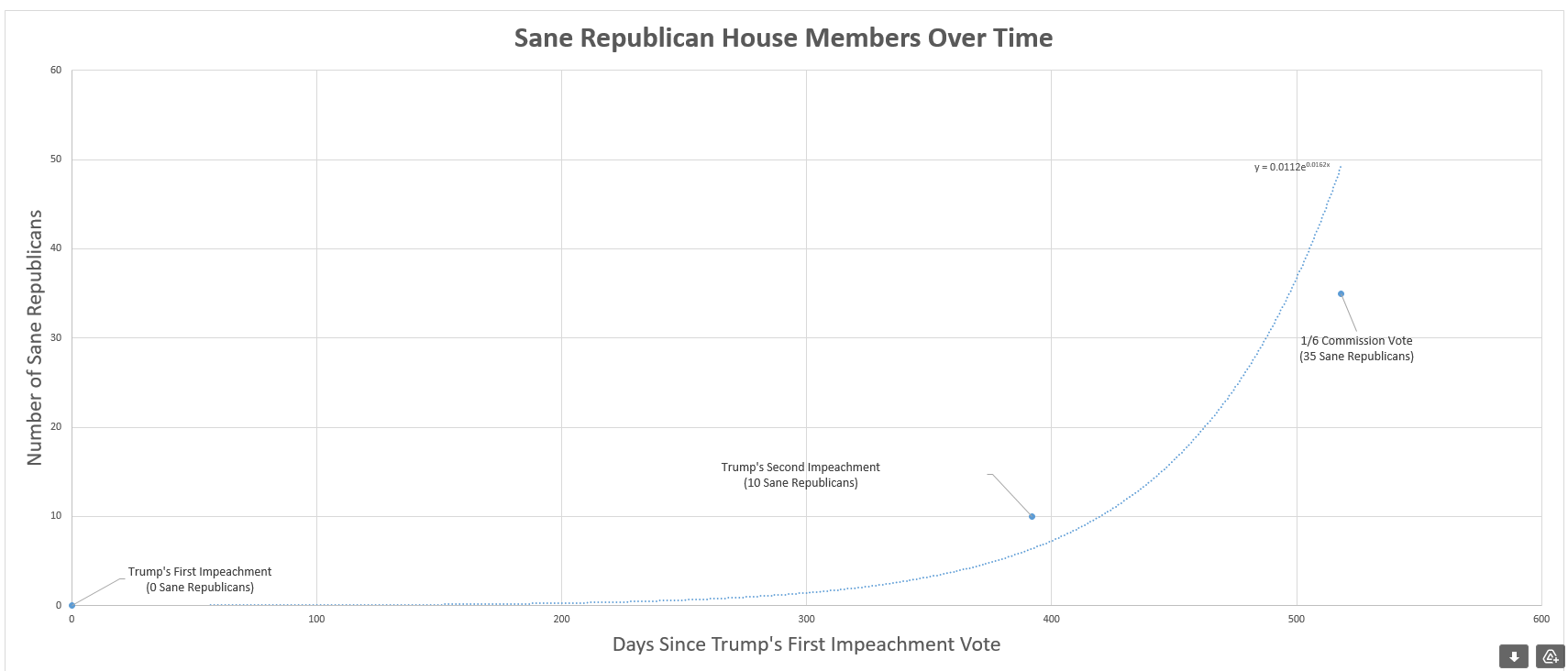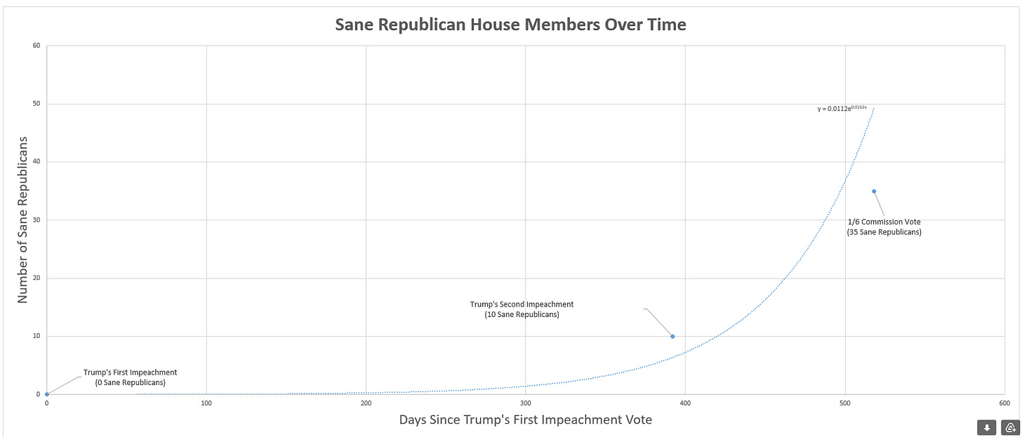 “Based on this trend line, “ he writes, “every House Republican (all 211, right down to Marjorie Taylor Greene!) will become sane by August 17.”