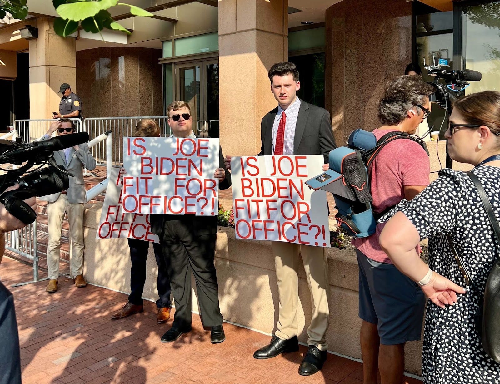 As the heat index neared 100 degrees, the Republican House campaign arm demonstrated their continued opposition to OSHA regulations by deploying three young staffers in black worsted wool2 suits to picket the front of the building. Their signs all posed the same exclamatory question: “IS JOE BIDEN FIT FOR OFFICE?!” Their faces glistened in the sun as camera crews, reporters, and still photographers around them drew all the same non-answers out of Democrats on their way into the building.