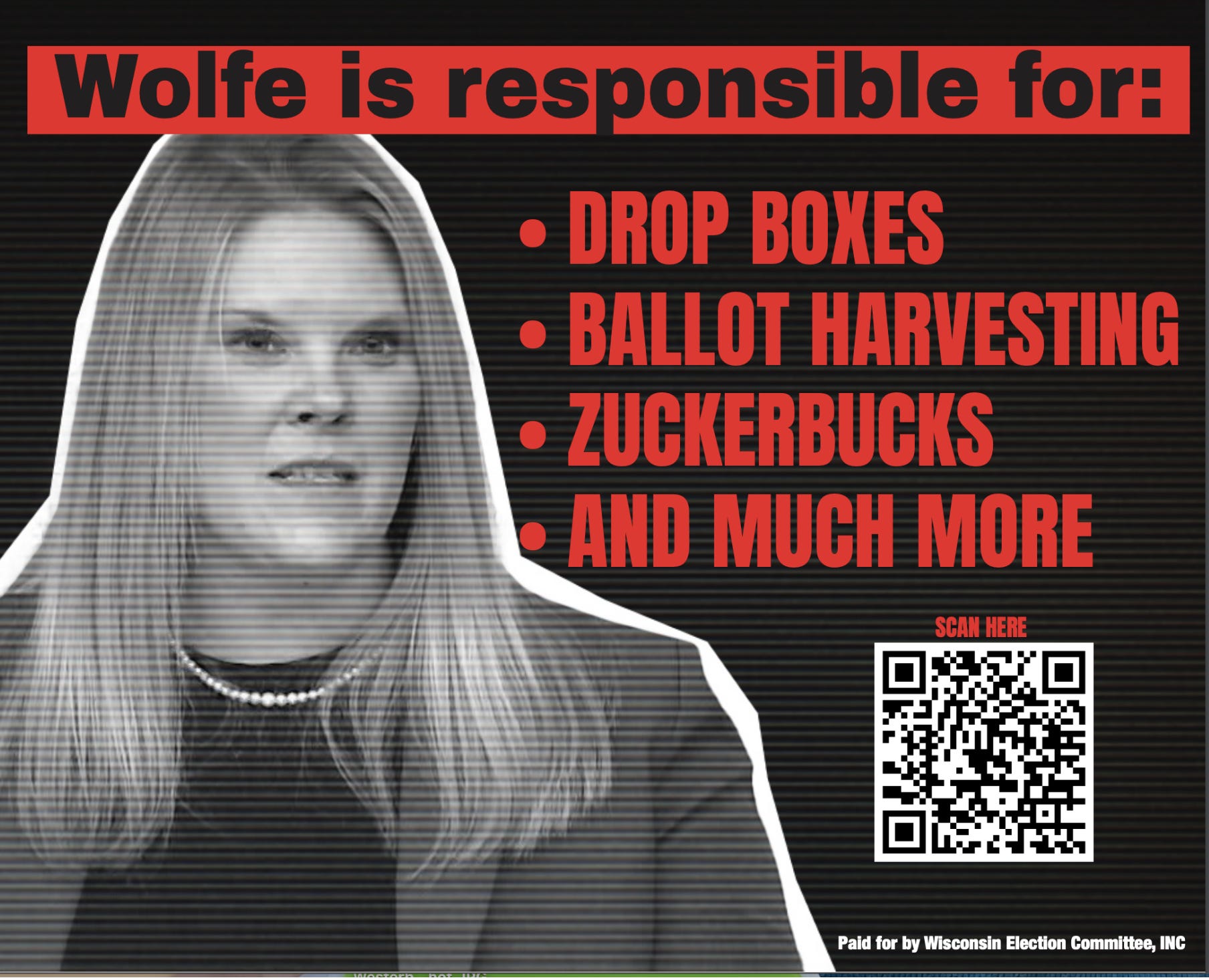 THE PRESSURE CAMPAIGN AGAINST WOLFE is designed to ruin her reputation and propagate the myth that fraud contributed to Trump’s Wisconsin defeat. Here is one image from the ads: