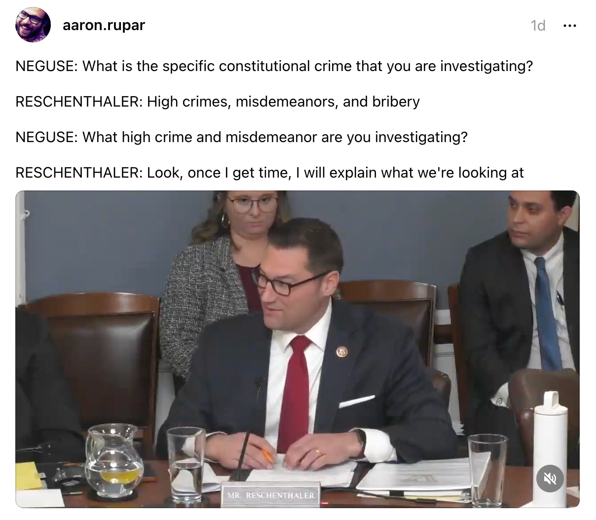 Here is the Republican elevator pitch on the impeachment of Joe Biden—and I’m begging you to click through to watch the video because this partial transcript doesn’t do it justice.