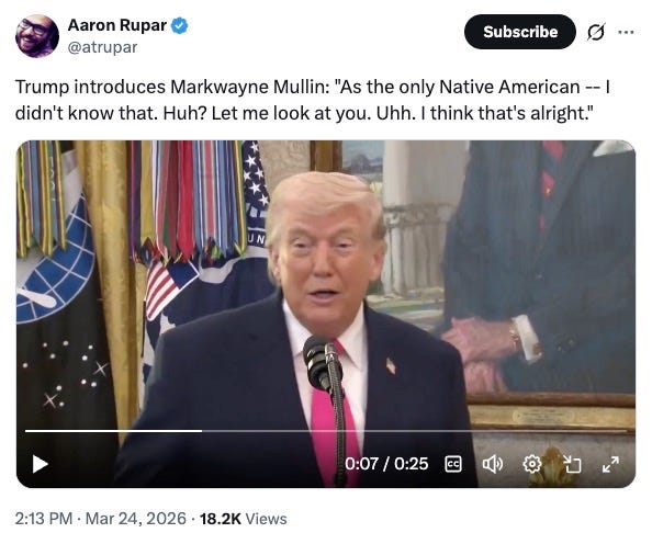 Meanwhile, Democrats forced another vote in the Senate yesterday to require congressional approval of Trump’s war. Republicans defeated the measure. So we now have a major war, well into its fourth week, which Trump is threatening to expand to a ground war, all being done without congressional approval, and all the sole responsibility of Donald Trump and his Republican party.