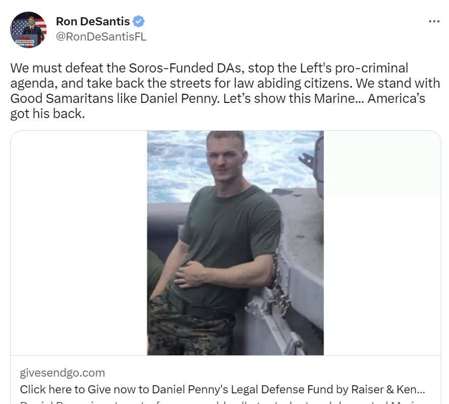 Trump, Nikki Haley, and Ron DeSantis have all rushed to celebrate Daniel Penny, the man charged with killing Jordan Neely. But DeSantis raised the ante, by calling him a “Good Samaritan,” and raising money for his defense.