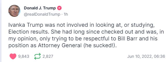Mar-a-Lago was not a happy place last night. Trump seemed especially triggered by Bill Barr’s testimony, and lashed out on his “TruthSocial” platform: