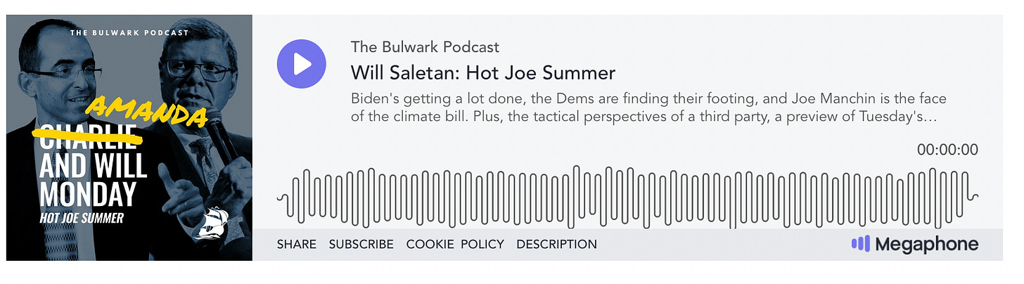 That’s it for me. Tech support questions? Email members@thebulwark.com. Questions for me? Respond to this message.