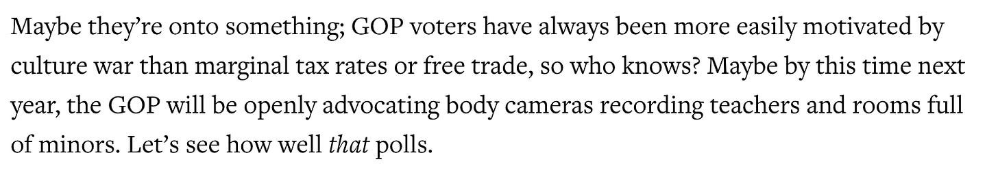 Tuesday, Tuesday, Tuesday. Get ready for tomorrow’s crazy primaries and stay tuned to The Bulwark for your coverage of how crazy the right is willing to go. If you’d like a preview of Missouri, I’ve got you covered. Don’t sleep on Arizona, either.