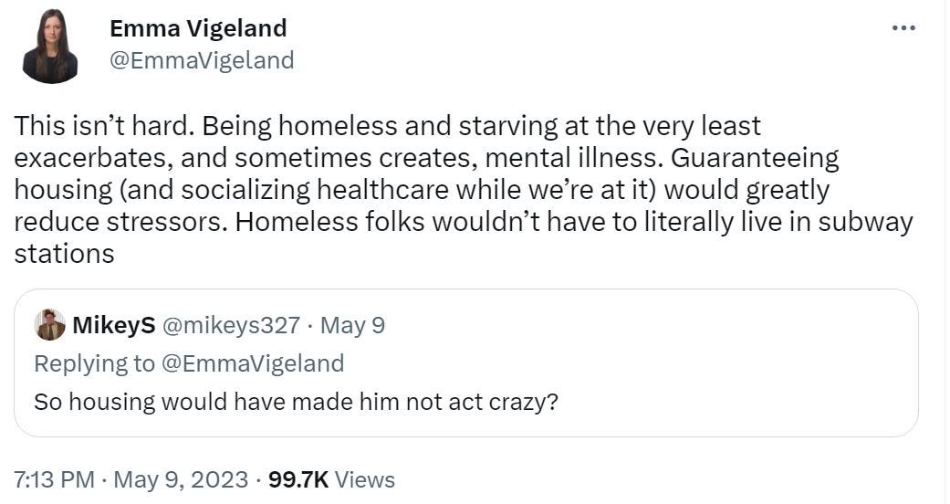 Vigeland has also echoed another common progressive argument: that homeless people suffering from mental health crises are primarily victims of homelessness and poverty.