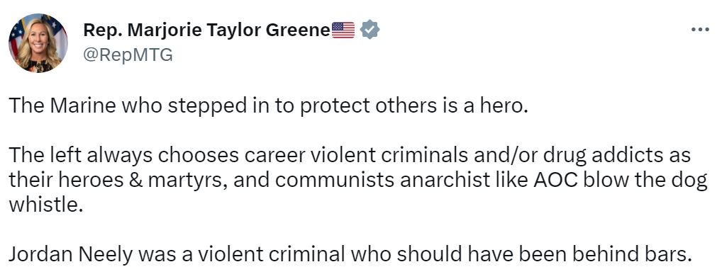 Without bothering to wait for the law to take its course, a number of Republican politicians have spoken out about the case. Donald Trump said that he believes Penny and his fellow passengers were in “great danger.” Other GOP presidential hopefuls have also rushed to praise Penny for protecting fellow passengers from a mentally disturbed violent criminal. Florida Governor Ron DeSantis hailed Penny as a “Good Samaritan” and promoted a link to a crowdfunding site that has so far raised $2.6 million for Penny’s legal defense. Nikki Haley, the former South Carolina governor, has called for Penny to be preemptively pardoned. Still other Republicans have called Penny a “hero.”