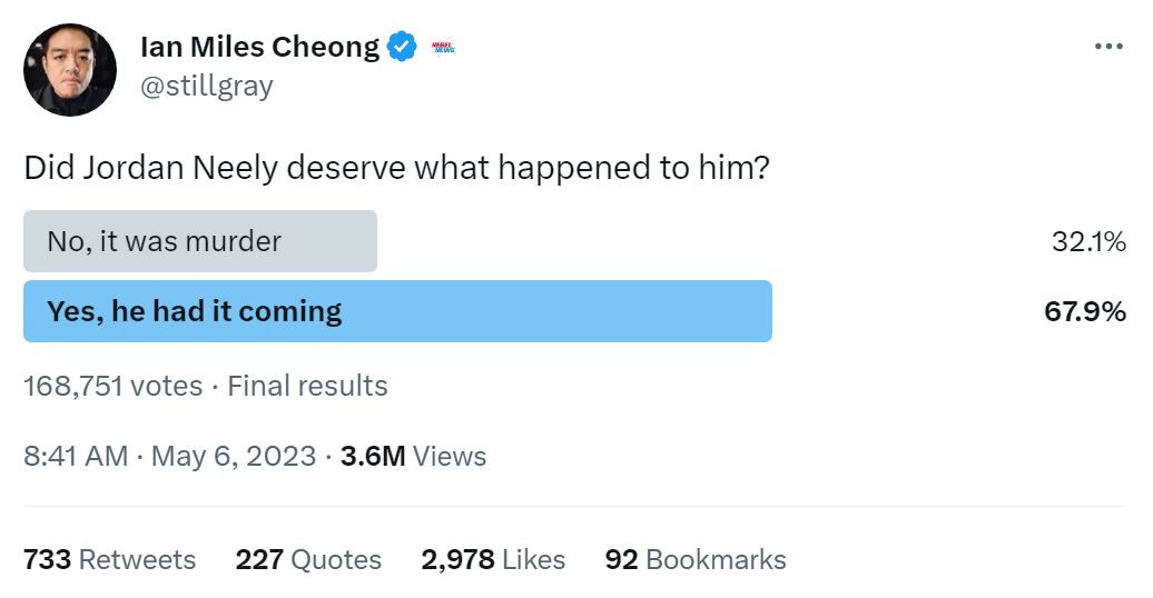 Ian Miles Cheong, the Malaysian blogger who has strong opinions on American cultural issues and nearly 600,000 Twitter followers, and who has been affiliated with a wide range of right-wing sites, including Human Events, the Daily Caller, and the Post-Millennial, outdid the rest with a truly vile poll: