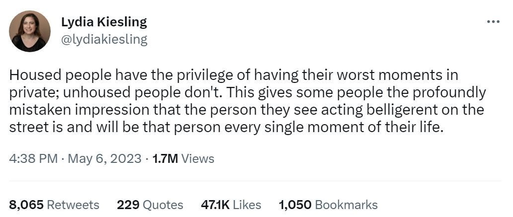 Novelist Lydia Kiesling touched on a similar theme in a viral tweet, asserting that “unhoused” people often seem more unhinged than others—and destined to remain that way—simply because they have no closed doors to hide their breakdowns behind: