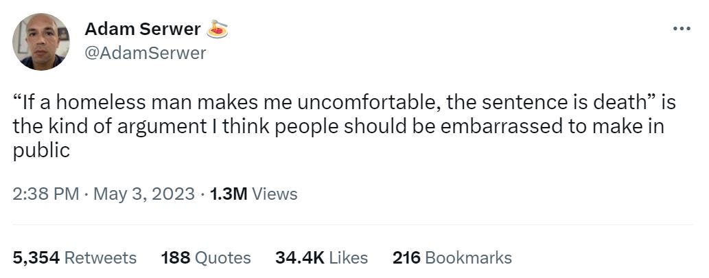 Meanwhile, on YouTube, right-wing comedian and commentator Steven Crowder weighed in with a monologue in which he asserted, twice, that you “forfeit your right to live” when you act as Neely did. Wait, so the death penalty is a proper punishment for creating the impression that you are about to commit an assault? (The “pre-crime” of assault, perhaps, to put things in Philip K. Dick’s terms?) Crowder hedged and noted that “I’m not saying that the man deserved to die, it’s a tragedy”—but, given his past crimes and the situation in which he put the people on that subway car, “Jordan Neely forfeited his right to live.” I’m not sure how to parse the logic, but the sentiment is loud and clear.