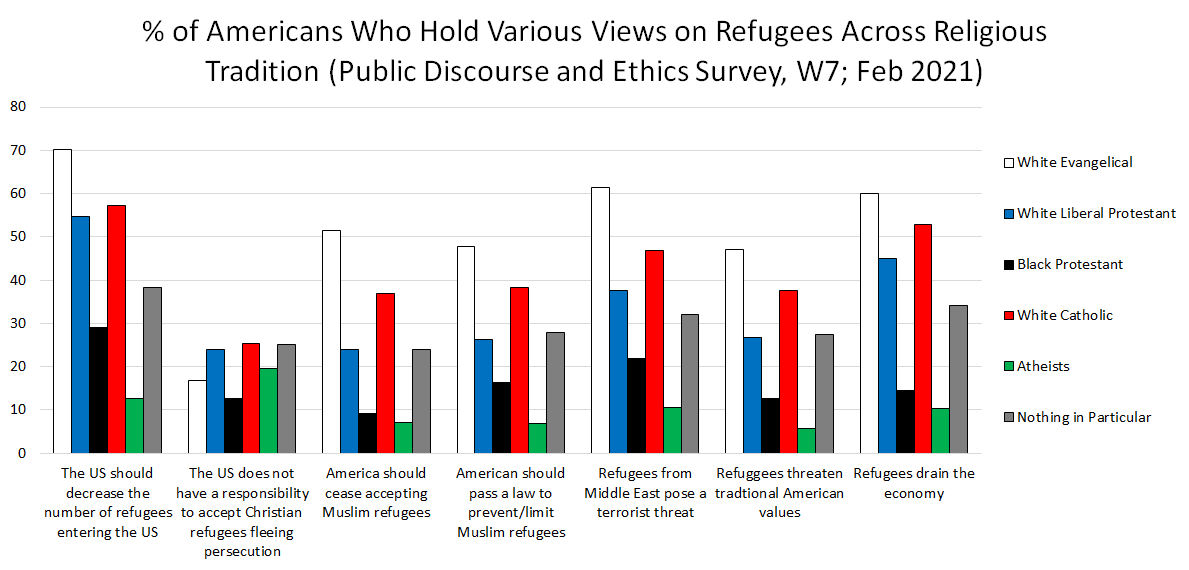 Look at this chart more closely. White evangelicals are the least sympathetic to the plight of refugees, but white Catholics are not really all that far behind.