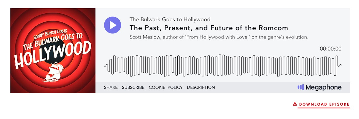 For more on the state of the romantic comedy and why they’ve found a home on streaming services, make sure to listen to this week’s Bulwark Goes to Hollywood with Scott Meslow. He’s the author of From Hollywood with Love, and we had a great chat about the past, present, and future of the genre.