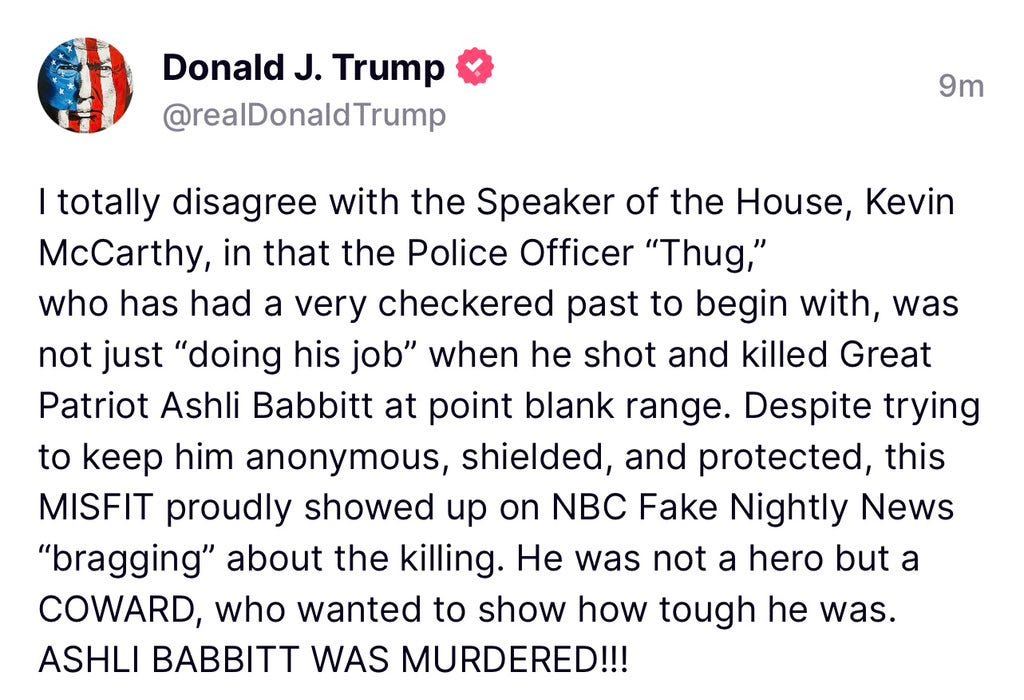 And, as the normies dithered, Trump continued to put out demented statements glorifying January 6th rioters and sliming the Capitol Police. (He was responding to one of Kevin McCarthy’s rare disagreements with MTG.)