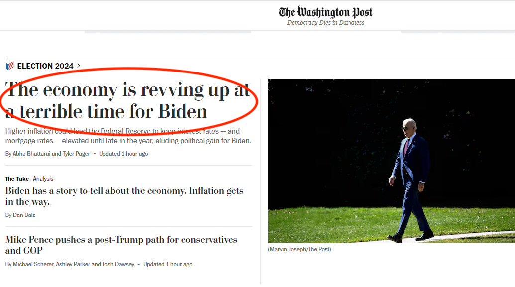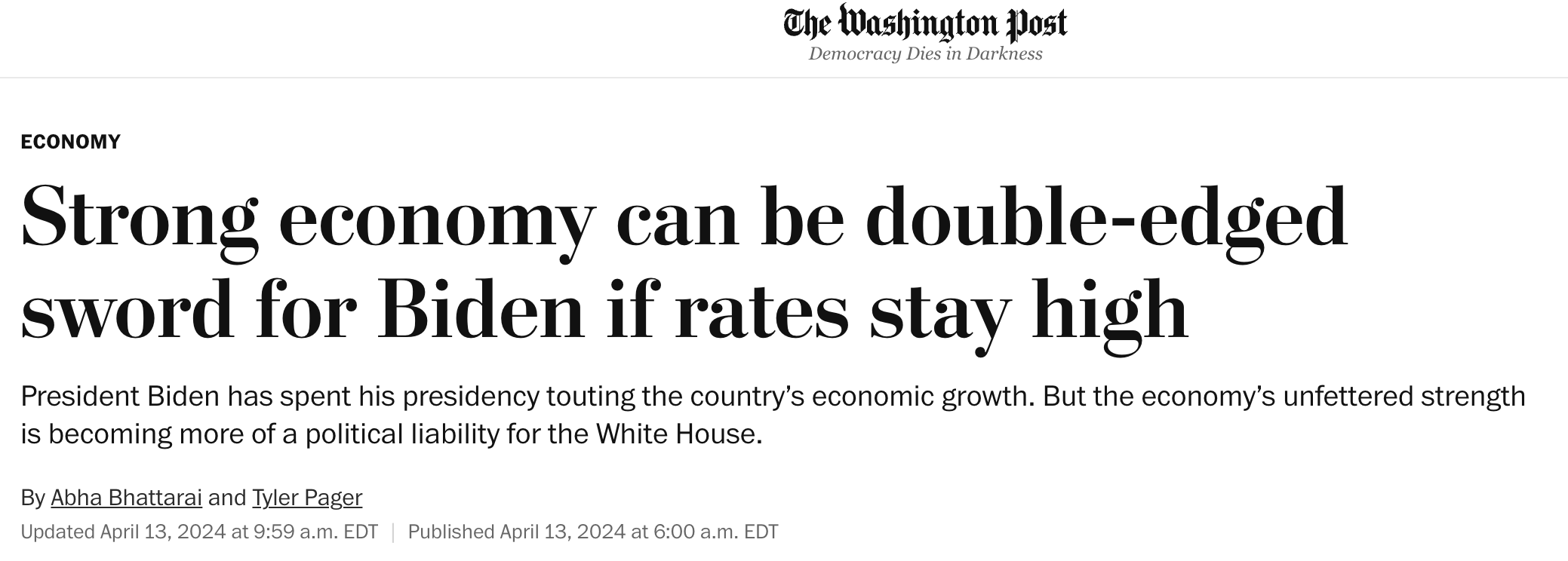 We’ve reached the ne plus ultra of Here Is Some Good News and Also Why It’s Bad for Biden headline writing. I present to you an April 13 story in the Washington Post by Abha Bhattarai and Tyler Pager. (Don’t click the link yet.)