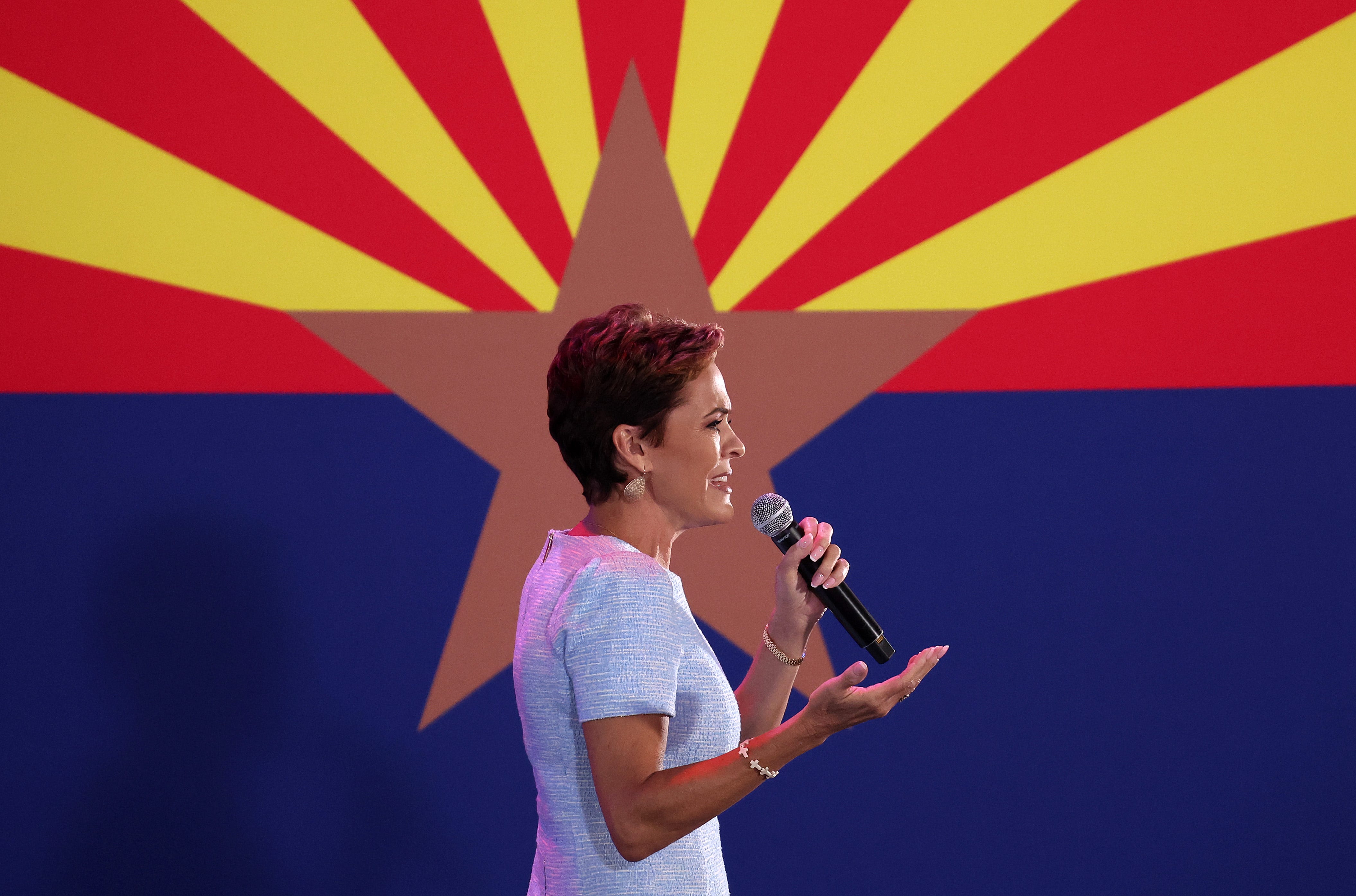 Arizona—It’s morning in Tucson and a wan Katie Hobbs speaks briefly to an empty parking lot, eyes darting to the ground. A few older liberal activist-types stand to her side. Scattered signage warns of the possible end to democracy and abortion rights. If it wasn’t for the campaign bus, you might have thought it was a gathering for a county council race in a remote desert hamlet. Both the candidate and I were chilly.