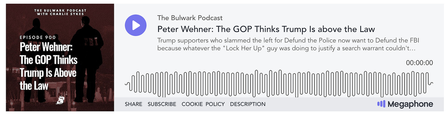 Trump supporters who slammed the left for Defund the Police now want to Defund the FBI because whatever the “Lock Her Up” guy was doing to justify a search warrant couldn’t possibly be illegal. Peter Wehner joins Charlie Sykes on today’s podcast.