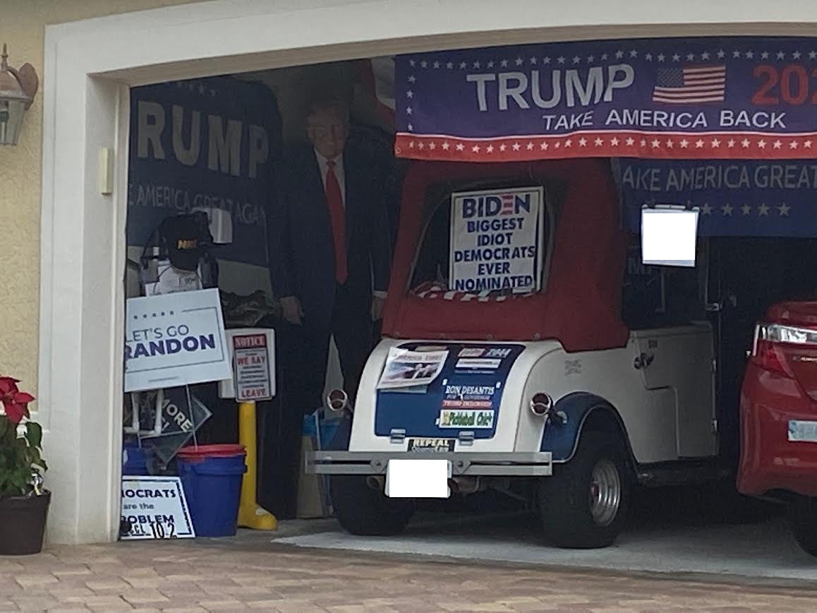 There is a retiree who has turned the family garage into a showcase of pro-Trump/anti-Biden banners and paraphernalia. The Villages has an ordinance that prohibits political signage displays in residential yards. So, in order to comply to the letter with that ordinance, the shrine to Donald sits in the garage and the garage door is left up so that all who pass by can marvel at the level of Trumpian devotion.