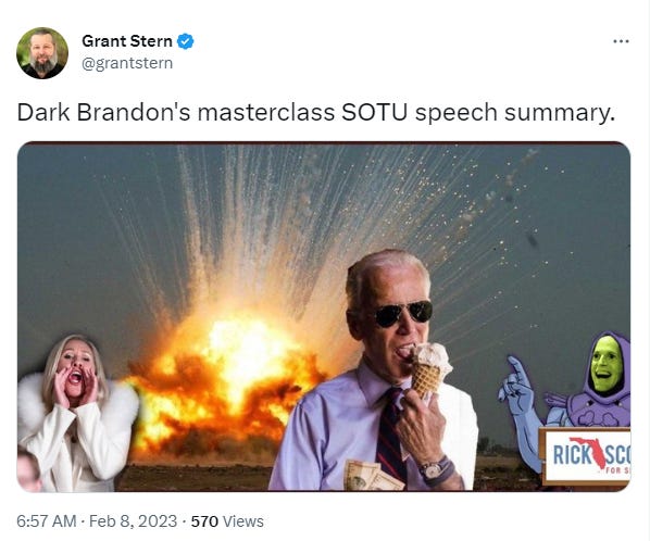 I have never enjoyed a SOTU so much in my life. I hope we can stop the “Biden’s too old” chorus now. He was spry and used decades of political experience to own the MAGAs. He even tried to help out poor SINO McCarthy as his weakness was on full display. Great tempo throughout as POTUS kept my attention the entire time.