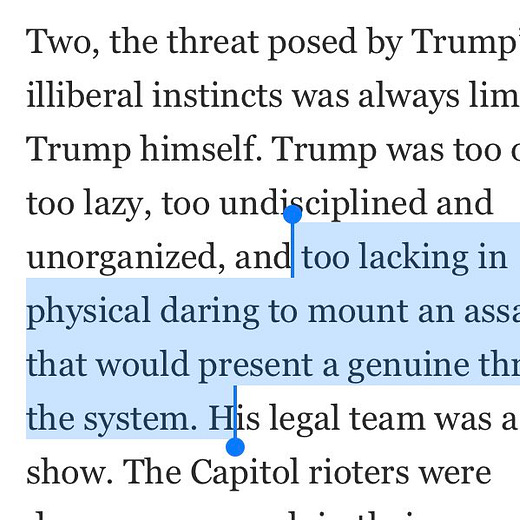 Trump’s illiberal instincts were never much of a real threat, he insists, because they were “always limited by Trump himself. Trump was too old, too lazy, too undisciplined and unorganized, and too lacking in physical daring to mount an assault that would present a genuine threat to the system.”