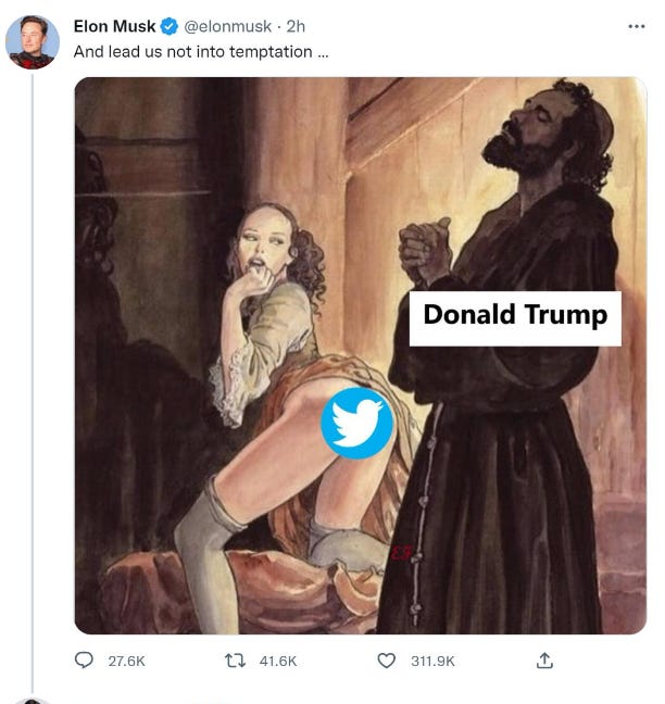8. Did I mention marketing? As Trump uses outrage to raise money from suckers, Elon is doing much the same to focus the attention on Twitter. You can’t buy this kind of advertising & the crazier the tweeting, the better. Oh let’s do a poll to see if Donald should return! Burn.