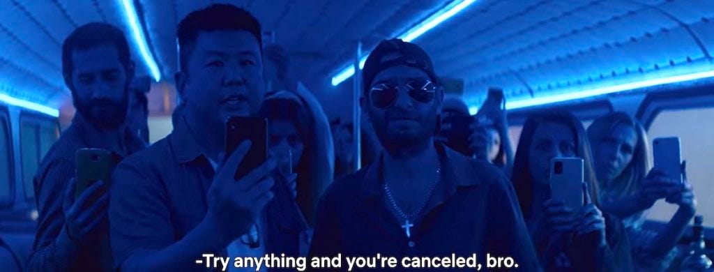 But it’s pretty good for us. I mean, I don’t know about you, but it’s hard not to grin at least a little as you’re watching a guy get chainsawed to death right after saying “Try anything and you’re canceled, bro” while he’s holding up a cell phone recording video as if it’s a modern escutcheon, livestreaming protection for the virtuous from the whips and lashes of the unenlightened.