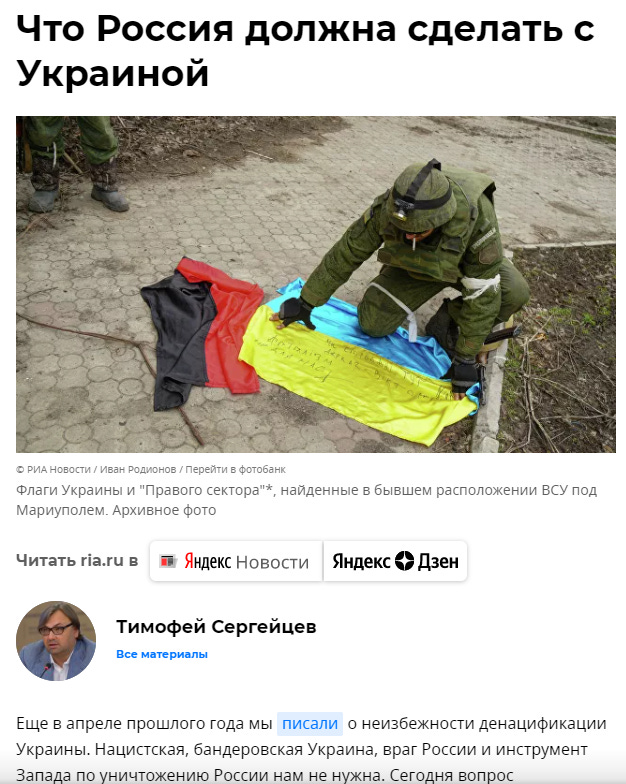 RIA Novosti is basically a Kremlin mouthpiece. The other day, it published a lengthy article titled "What Russia should do with Ukraine,” which, as Steven Pifer noted, “calls for deNazification of Ukraine -- and advocates Nazi-like methods to do so. Russia is applying such methods in Mariupol and Bucha.”
