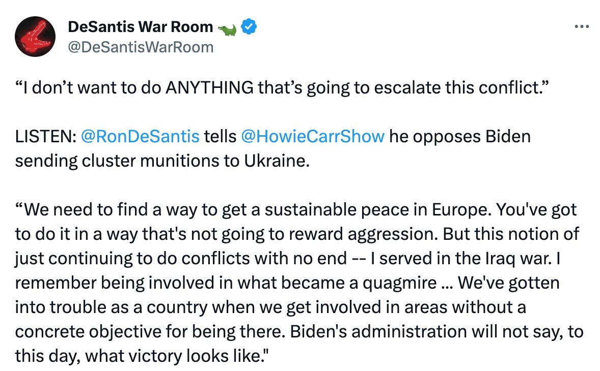 The guy in (a distant) second place, Ron DeSantis, keeps going out of his way to say that there will be no “blank check” for Ukraine and that he won’t do “ANYTHING” to “escalate” the “territorial dispute.”
