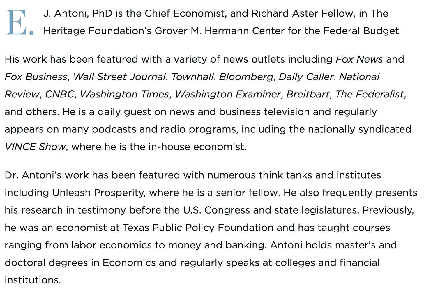 That’s it. That’s the full CV.1 He wrote some pieces for Townhall, Breitbart, and the Federalist, went on Fox News, and now he’ll be running an organization of 2,000 economic specialists.2