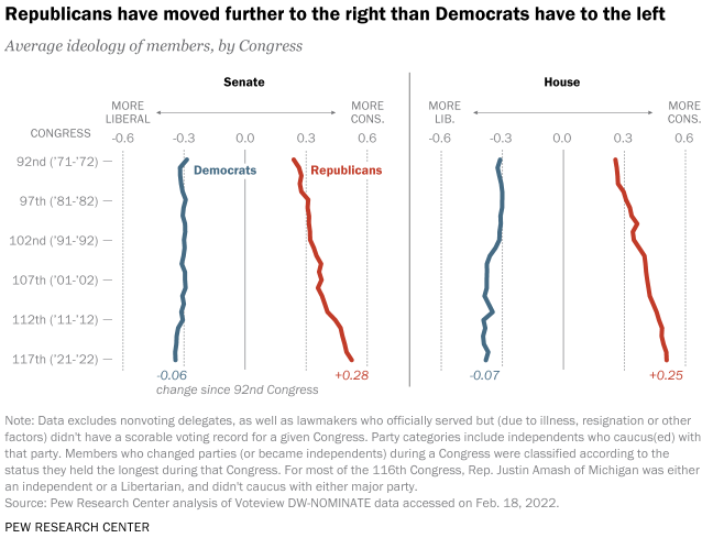 The fourth risk is failing to consider shifts in what’s even on the table in congressional votes. Imagine two situations—one in which a bill to repeal the income tax is put forward, and another in which a bill to lower the income tax rate by one percent is put forward—and imagine that in both situations all Republicans vote for the bill and all Democrats vote against it. The former clearly represents a far more extreme move on the part of the Republicans. But DW-NOMINATE would score both situations the same way because everyone who voted “aye” or “nay” in the first situation did so in the second situation as well, and vice versa; all it can do is compare one person’s voting behavior to another’s. It therefore has trouble taking into account the dynamics and exigencies of the issues peculiar to our present political climate, which are often part of the story right-wingers tell about left-wing polarization in particular.