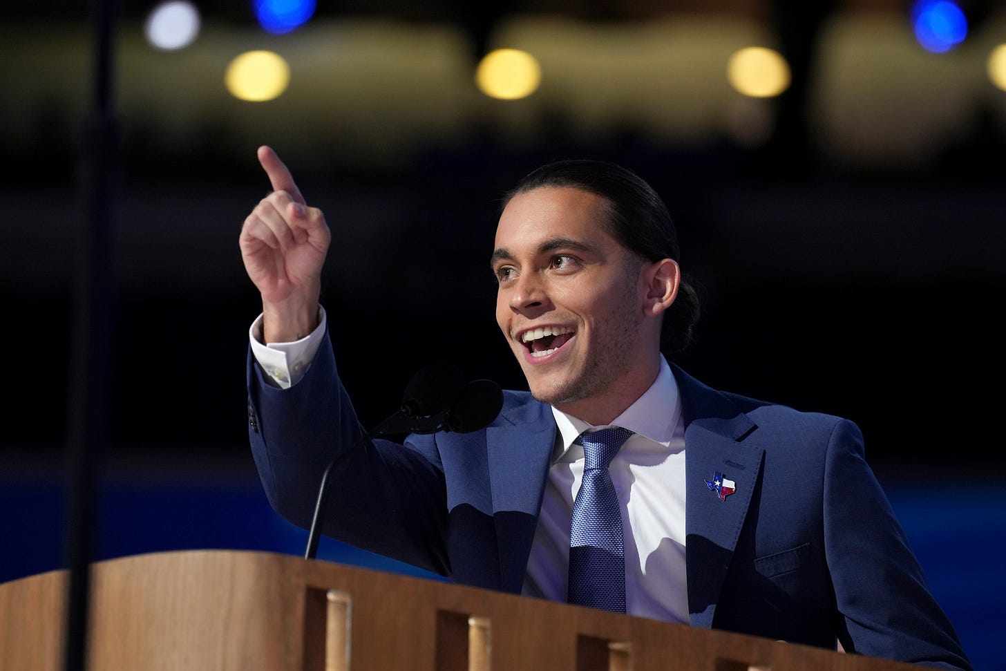 Just this month alone, three Democratic governors widely considered to be mulling presidential bids have invited Espina to events around the country, eager to test-drive their likability among a Latino audience by filming low-friction videos with him. Previously, Espina met with three other potential White House aspirants: Rep. Ro Khanna, Gov. Wes Moore, and Pete Buttigieg.1 And in between, Espina put his cultural influence behind two of the most promising Democrats in Texas—state Rep. James Talarico and Tejano singer Bobby Pulido—helping each rack up big numbers among Hispanic voters in their respective primary wins.