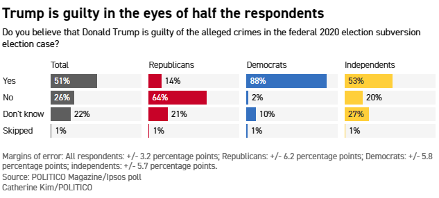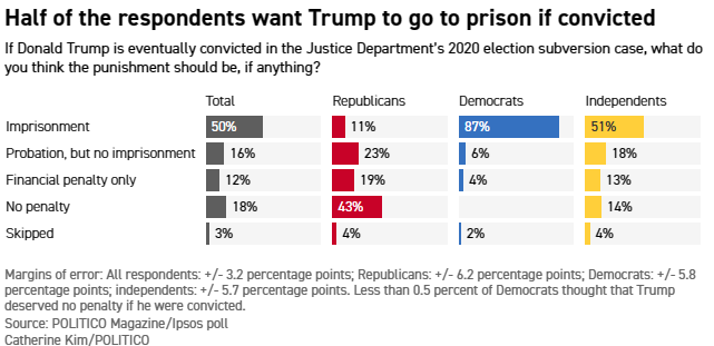 Furthermore, public sentiment in certain areas — including how quickly to hold a trial and whether to incarcerate Trump if he’s convicted — is moving against the former president when compared to a previous POLITICO Magazine/Ipsos poll conducted in June….