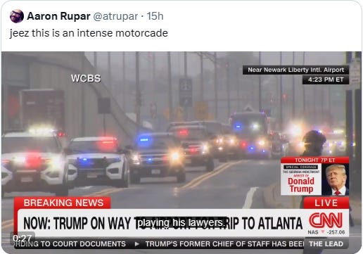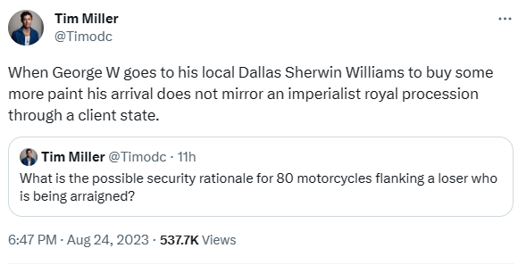My colleague Tim asks an excellent question. “What is the possible security rationale for 80 motorcycles flanking a loser who is being arraigned.”