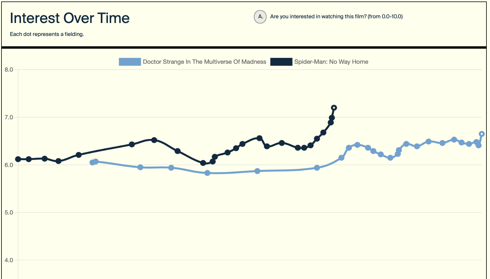 Despite lower awareness and lower interest—and despite the fact that, I think, people were more concerned about No Way Home spoilers than they are Multiverse of Madness spoilers—audiences say they’re more interested in seeing Doctor Strange in the Multiverse of Madness in a theater than at home.