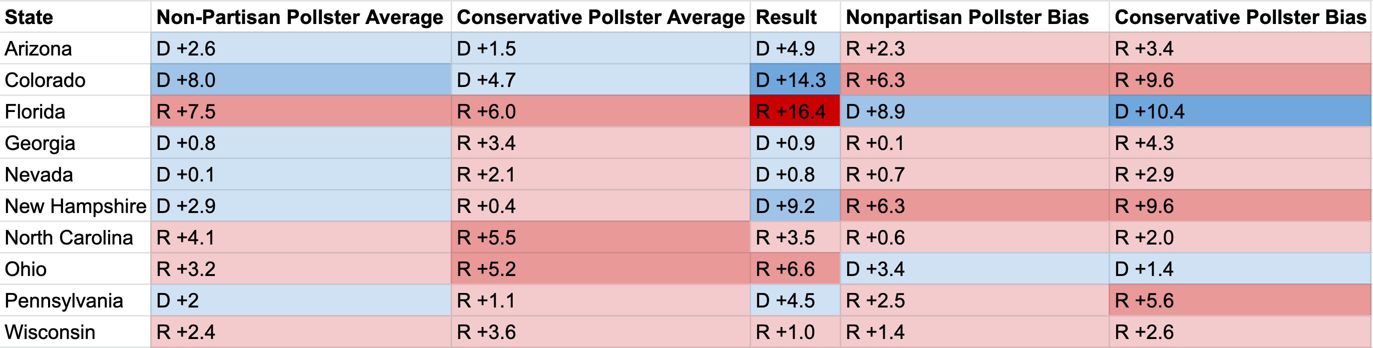 These Republican firms, such as the Trafalgar Group, overstated Republican strength by roughly 3 points more than the non-partisan polls. Trafalgar, for instance, showed the GOP with a closing advantage in New Hampshire, Nevada, Pennsylvania, Georgia, and Arizona. In states that saw Democratic blowouts, such as Washington and Colorado, they (incorrectly) showed tight races within the margin of error. In nearly every case, they look to have missed the mark substantially.