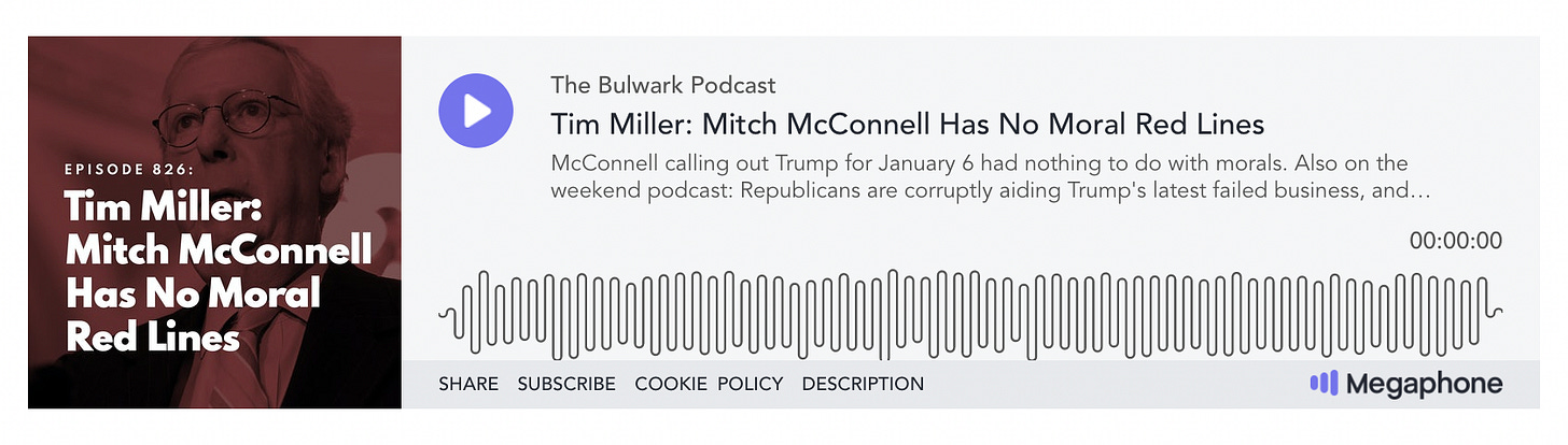 McConnell calling out Trump for January 6 had nothing to do with morals. Also on the weekend podcast: Republicans are corruptly aiding Trumpâs latest failed business, and widening their campaign to demonize gay people. Plus, Tim Miller and Charlie Sykes have book recs!